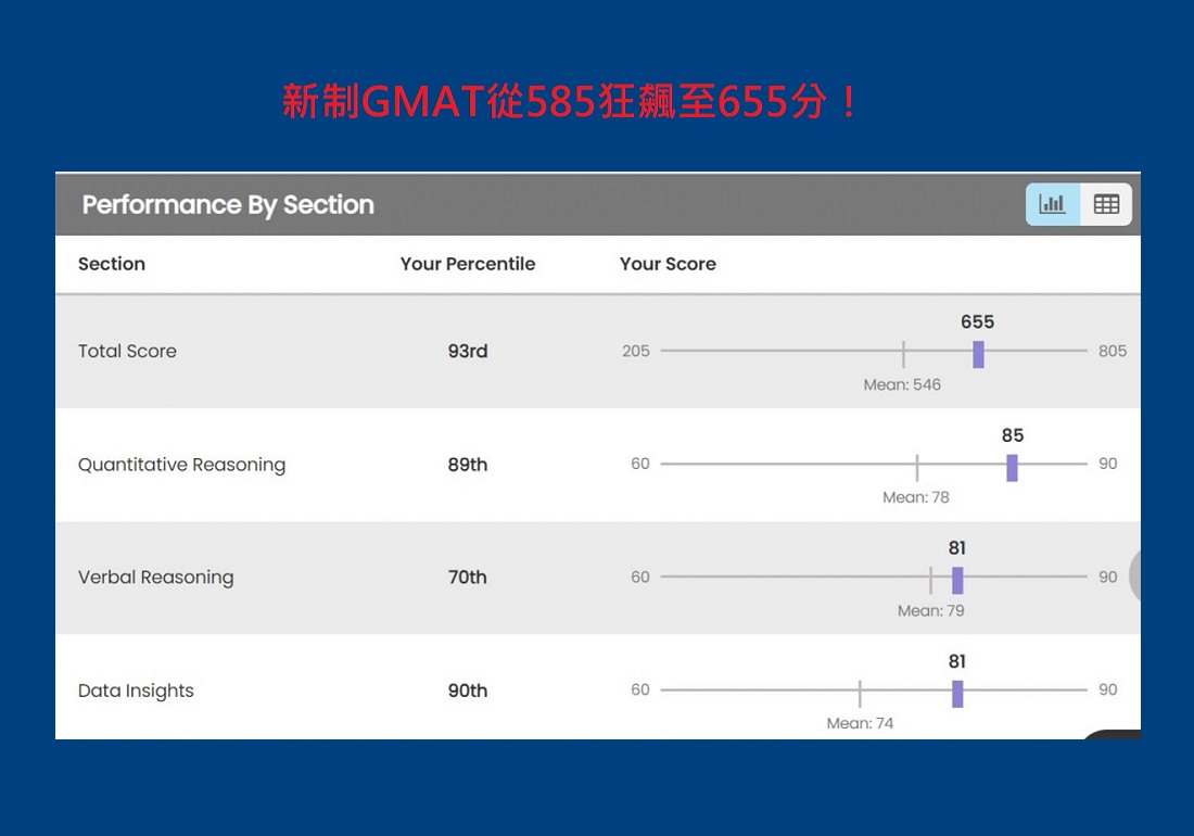也有原本對數學很害怕經過老師指導後,GMAT Q進步12分的同學、新制GMAT從585進步到655分的同學、來自香港GRE 320分的同學、家教後雅思成績暴衝到8分的同學、一周多內雅思寫作突破至7分的同學。