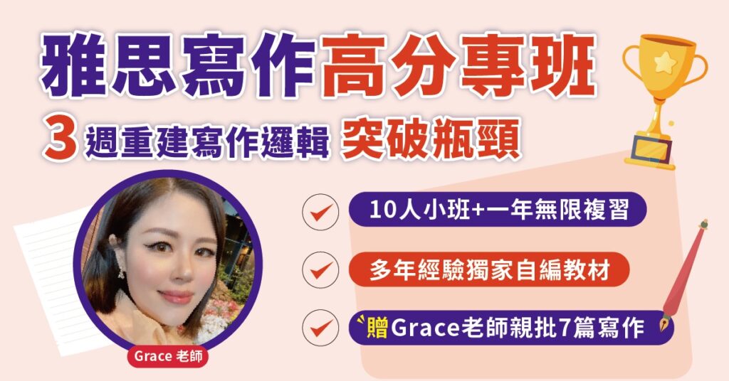 • 不同於部分補習班使用書局公開教材,Grace老師針對台灣考生特點,結合多年教學經驗,自編教案與寫作模板。每一堂課都強化最常失分的題型、架構和思路,教你答題更精準。